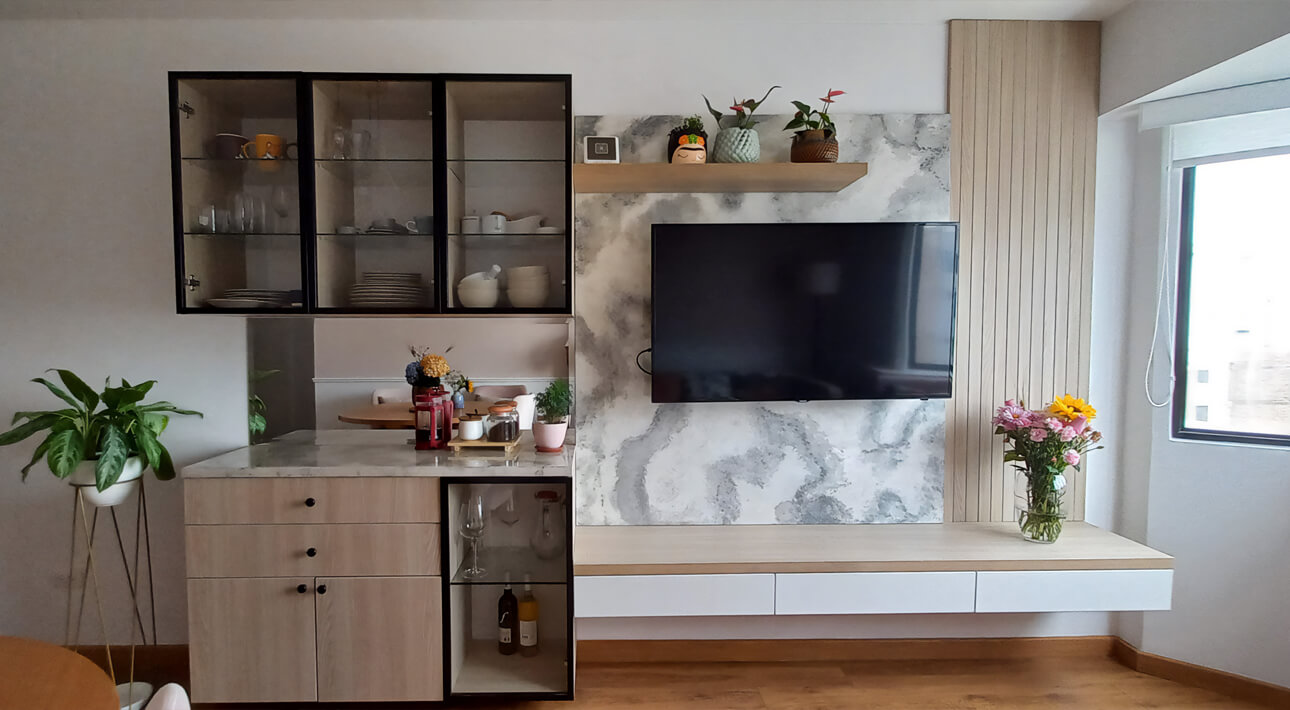 Los amaderados claros equilibran la composición y suman naturalidad, mientras que las molduras blancas enmarcan los espacios con una elegancia sutil y atemporal. Como punto focal, el panel de resina epóxica con efecto mármol detrás del televisor introduce un gesto contemporáneo y sofisticado.